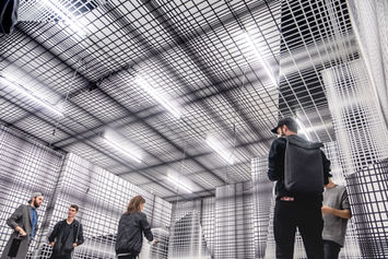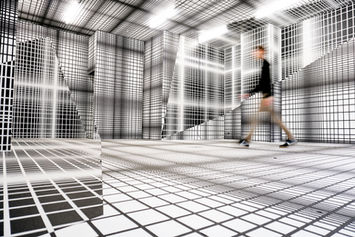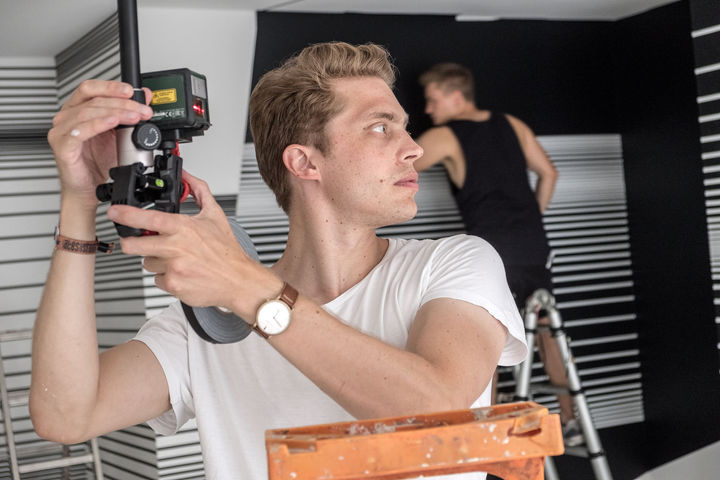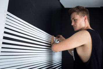 This project was all about combining and extending the analogue world through augmented reality: 6 different artists/collectives created unique room installations or murals that followed different approaches on how to experience their art digitally. Our basic idea was to create a massive monochrome room experience that you can add color to through the use of a digital device. We therefore covered the room fully with horizontal and vertical lines, using only black and white tapes. By varying distances in between the lines, an illusion of depth emerged. When hovering with a cell phone over the walls, you were able to generate colorful square patterns into this room, making it a unique experience for everyone. Big thanks to XI design, VR-Nerds and Cheil for putting everything toegether and making it happen!