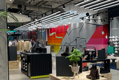 This project was brought to life on the walls for the reopening of the Görtz store in Düsseldorf – one of the first day-and-night concepts on this scale. The black-and-white hatching in a cubist style represents the urban jungle, while sunrises and sunsets – depicted here in graphic gradients – create a contrasting sense of natural dynamism. Measuring 16 by 10 meters, this artwork stands as a striking element within the space.