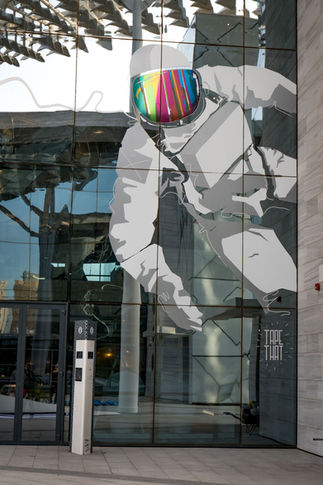 We had an awesome experience in Kuwait, a country in which Tape Art was almost totally unknown. The Sheikh Abdullah Al Salem Cultural Centre in Kuwait City is a brand new and huge complex of museums, galleries and workspaces, which is offered to the public for free education. In preparation for the official opening of the centre we where invited to design two facades and the hallway of the fine arts centre as well as holding a workshop with local art students. Our mural on the facade of the museum for science and space shows a 7m high astronaut. By night the reflecting lights from inside and outside of the glass let the astronaut seemingly float in free space. For the visitors it seems as if they are looking at him from the inside of a space station. The second mural shows the development of technologies in transportation and robotics in a playful way. A futuristic airplane is about to break through the structure of the facade after having had an adventurous flight. In the hallway of the fine arts center we created a mosaic out of many different sorts of adhesive tapes. As the hallway is meant to be an exhibition space for resident artists we left a lot of free space. The creation of this installation also worked as a live on sight lesson for our workshop participants who helped us creating the artwork. Participating Artists: Nicolas Lawin, Stefan Busch, Adrian Dittert